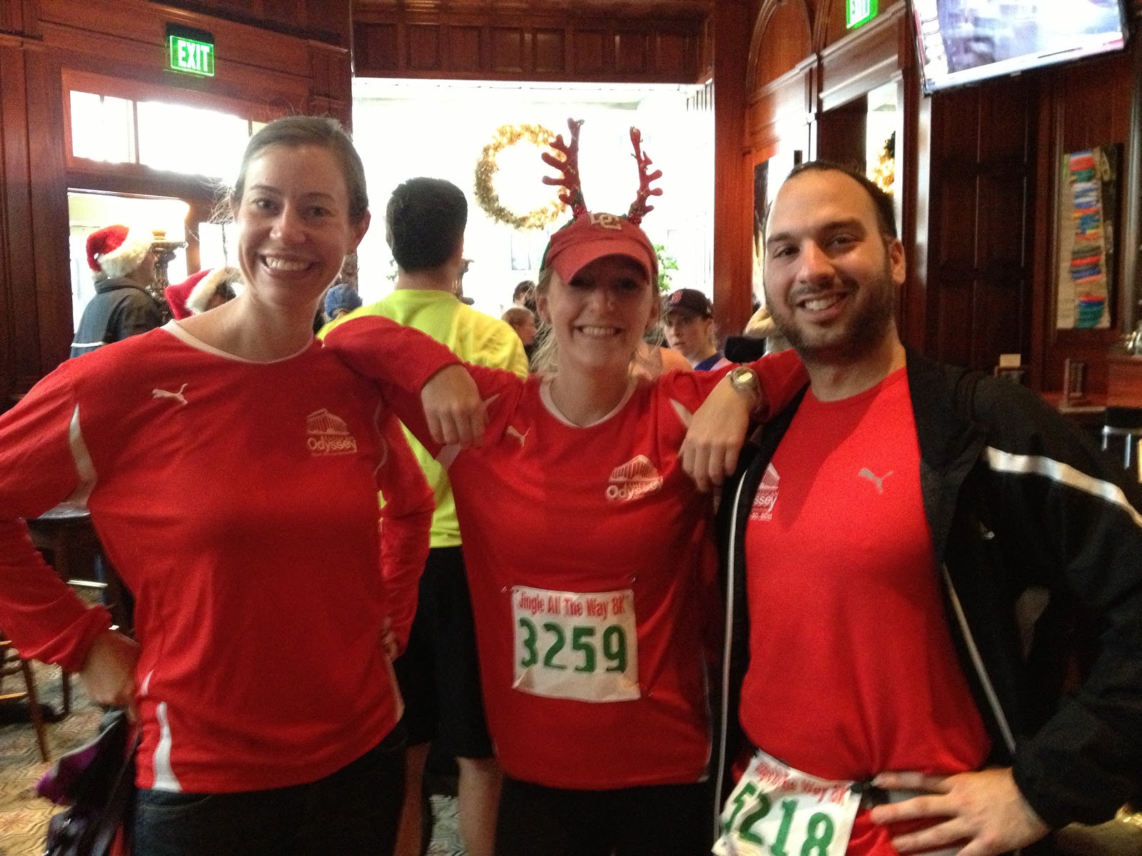 The forecast called for a cool, rainy morning, but it was overcast and in the mid-50s before the race. The race started 10 minutes late, but no one seemed to mind. We were too busy checking out everyone's holiday-themed outfits.